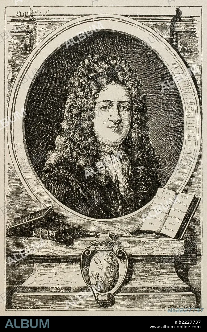 Gottfried Wilhelm Leibniz (1646-1716). German mathematician and philosopher. Engraving in The Universal History, M. Verges, 1917.