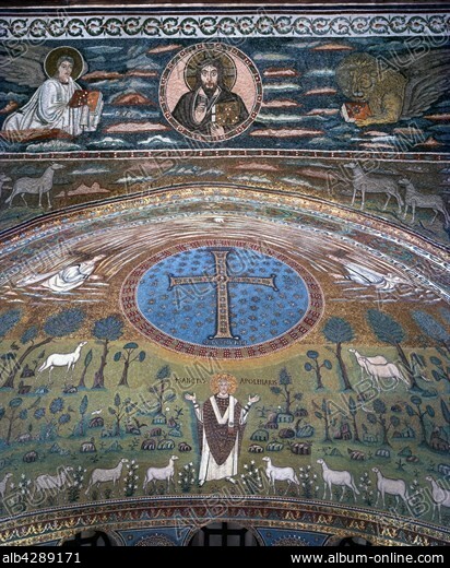 Caption: Basilica of Sant'Apollinare in Classe, Ravenna. In the apse, mosaic representing the Transfiguration, Apollinaris raising arms, Moses and the Prophet Elijah next to him.. Above the dome; representation of the Holy City of Jerusalem and Bethlehem, from where the apostles (symbolized as sheeps) are leaving.. On top: representation of the Christ in a medalion, surrounded by symbols of the Four Evangelists.. 6th century.. Built in the 6th century, the basilica was consecrated in 549 by Bishop Maximianus of Ravenna and dedicated to Apollinaris, first Bishop of Ravenna.
