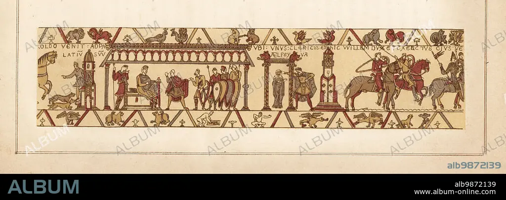 Duke William of Normandy receiving Harold Godwinson in his palace at Rouen. At right, a meeting between a mystery woman Aelfgyva (perhaps Algitha, widow of Griffith King of Wales) and a cleric. Chromolithograph by William Mossman after an illustration by Charles Stothard made for the Society of Antiquaries in Rev. John Collingwood Bruces The Bayeux Tapestry Elucidated, John Russell Smith, London, 1856.