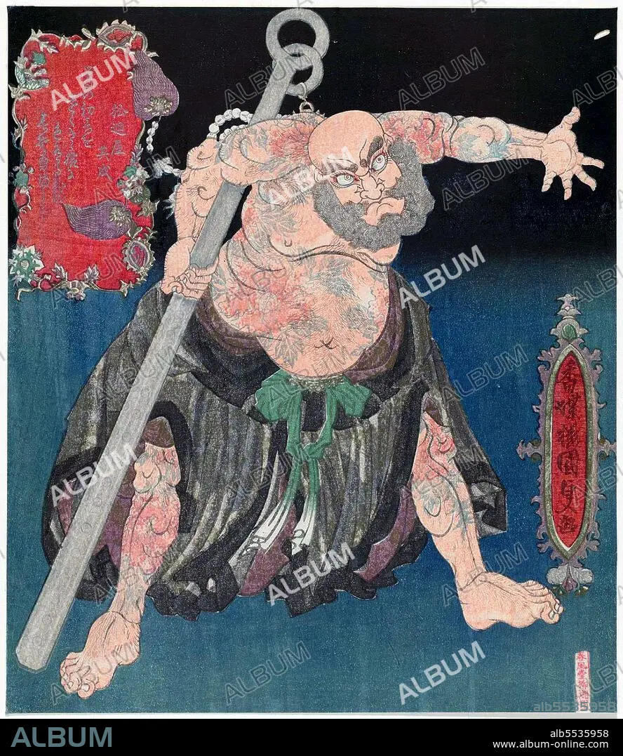 Caption: Lu Zhishen, nicknamed 'Flowery Monk', is a fictional character in the Water Margin, one of the Four Great Classical Novels of Chinese literature. He is the lead character in the first major story cycle of the novel, in which he comes to epitomise loyalty, strength, justice but also brashness. He ranks 13th of the 36 Heavenly Spirits of the 108 Liangshan heroes. Utagawa Kunisada (Japanese: ?? ??; also known as Utagawa Toyokuni III (??????); 1786 – 12 January 1865) was the most popular, prolific and financially successful designer of ukiyo-e woodblock prints in 19th-century Japan. In his own time, his reputation far exceeded that of his contemporaries, Hokusai, Hiroshige and Kuniyoshi.