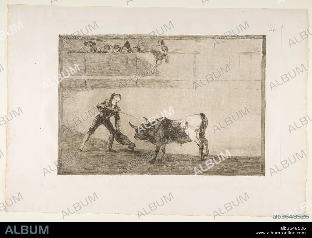 Plate 30 of the 'Tauromaquia': Pedro Romero killing the halted bull. Artist: Goya (Francisco de Goya y Lucientes) (Spanish, Fuendetodos 1746-1828 Bordeaux). Dimensions: Plate: 9 3/4 × 13 3/4 in. (24.7 × 35 cm)