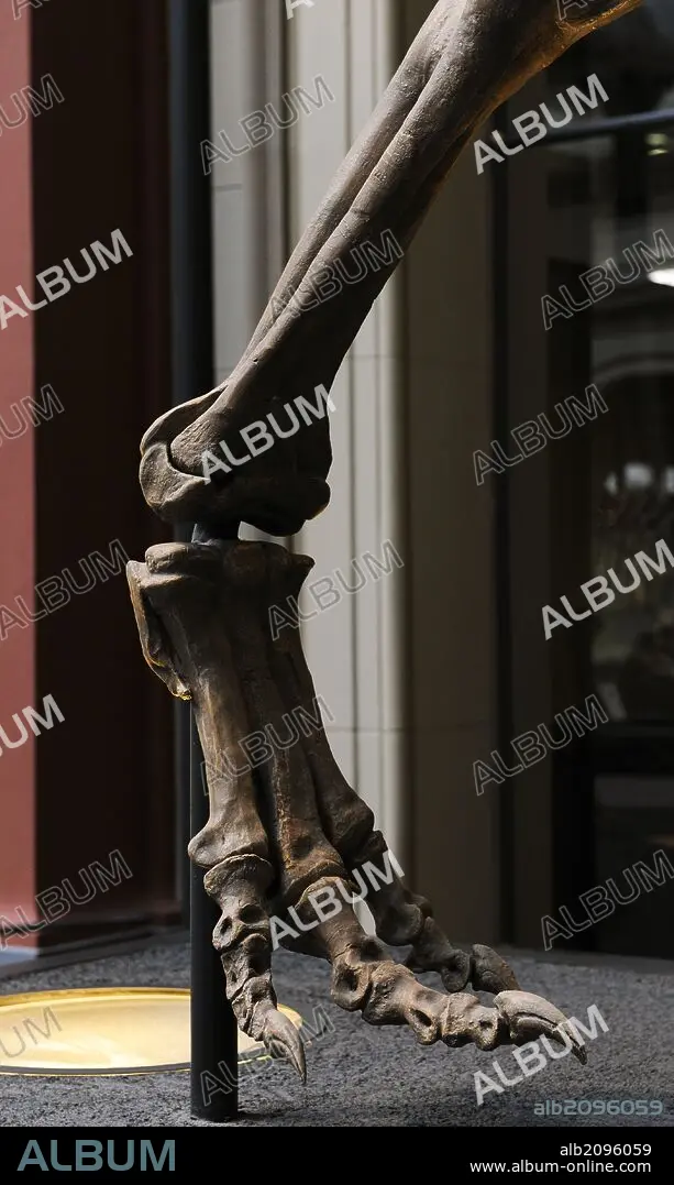 Caption: Allosaurus, dinosaurs terópodos alosáuridos. He lived at the end of the Jurassic period and at the beginning of the Cretaceous, about 156 and 144 million years ago, in the Kimeridgian, the Titonian, in what is now North America and Europe. Reproduction of a specimen in the room of the dinosaurs. Detail lower extremity. Museum fur Naturkunde. Berlin. Germany. Europe.