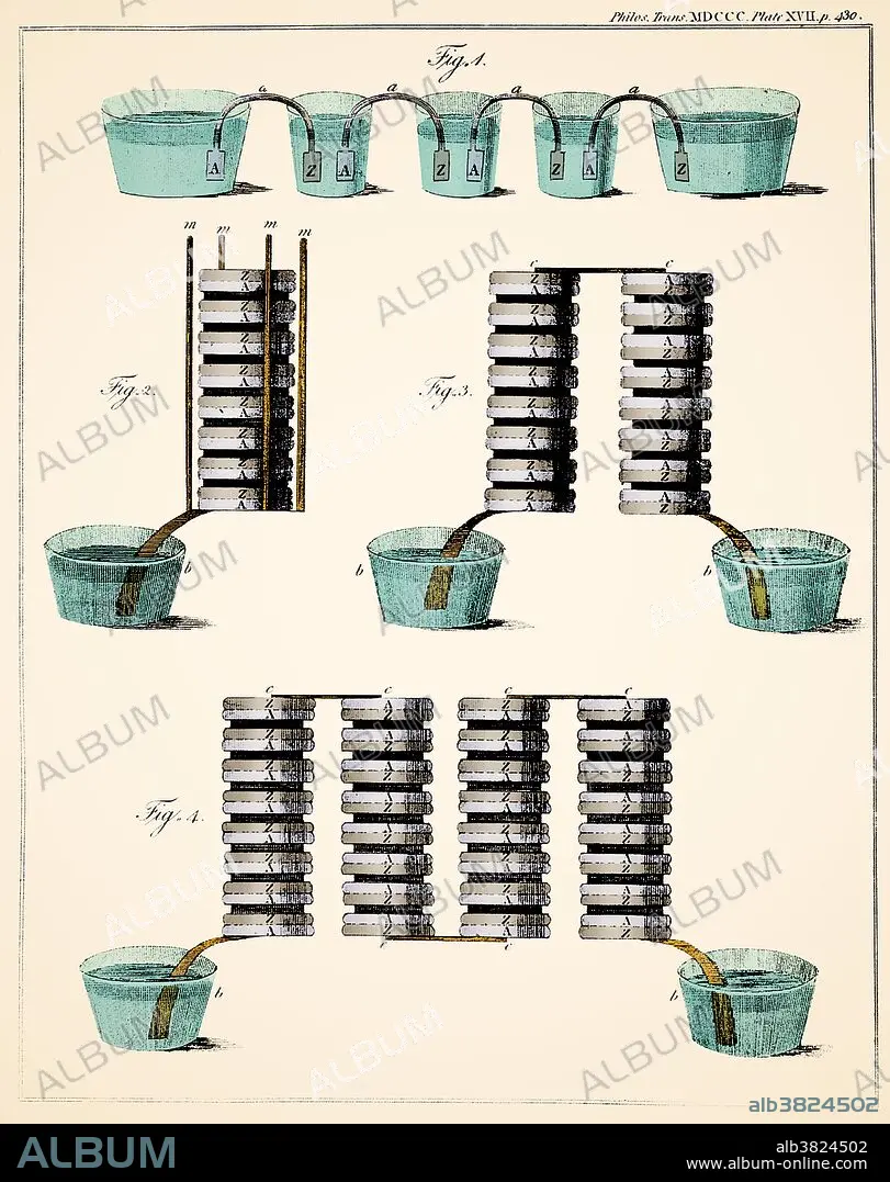 In 1800 Alessandro Volta (February 18, 1745 - March 5, 1827) described the Crown of Cups in a letter to Joseph Banks, the President of the Royal Society. It consisted of a series of glasses, containing acidulated or salt water, and connected by metal straps dipping into the liquid. These straps consisted of a ribbon of one metal (copper) soldered to the end of a ribbon of another metal (zinc). This was an alternative to the voltaic pile. The voltaic pile was the first electrical battery that could continuously provide an electric current to a circuit. Volta stacked several pairs of alternating copper (or silver) and zinc discs (electrodes) separated by cloth or cardboard soaked in brine (electrolyte) to increase the electrolyte conductivity. When the top and bottom contacts were connected by a wire, an electric current flowed through the voltaic pile and the connecting wire. This image has been color enhanced.