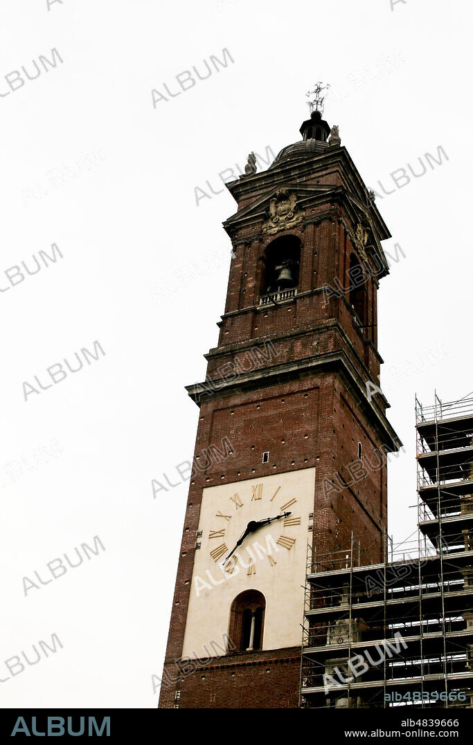 Monza, Brianza, Lombardy, Northern Italy. Monza Cathedral during restoration work. It is dedicated to St. John the Baptist (San Giovanni Battista) and was built between the fourteenth and seventeenth centuries. The bell and clock tower.