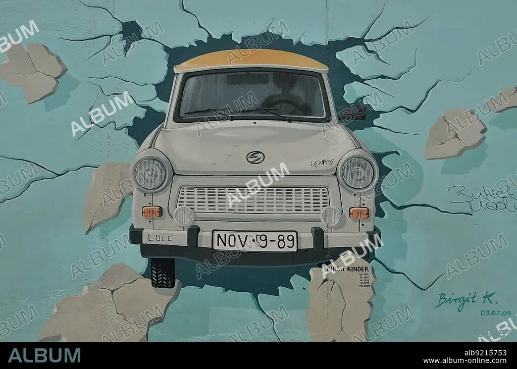 Caption: Birgit Kinder, "Test the Best", mural, painting of a Trabant car breaking through the Berlin Wall, by Birgit Kinder, East Side Gallery, Berlin-Friedrichshain, Germany, Europe, PublicGround, Europe
