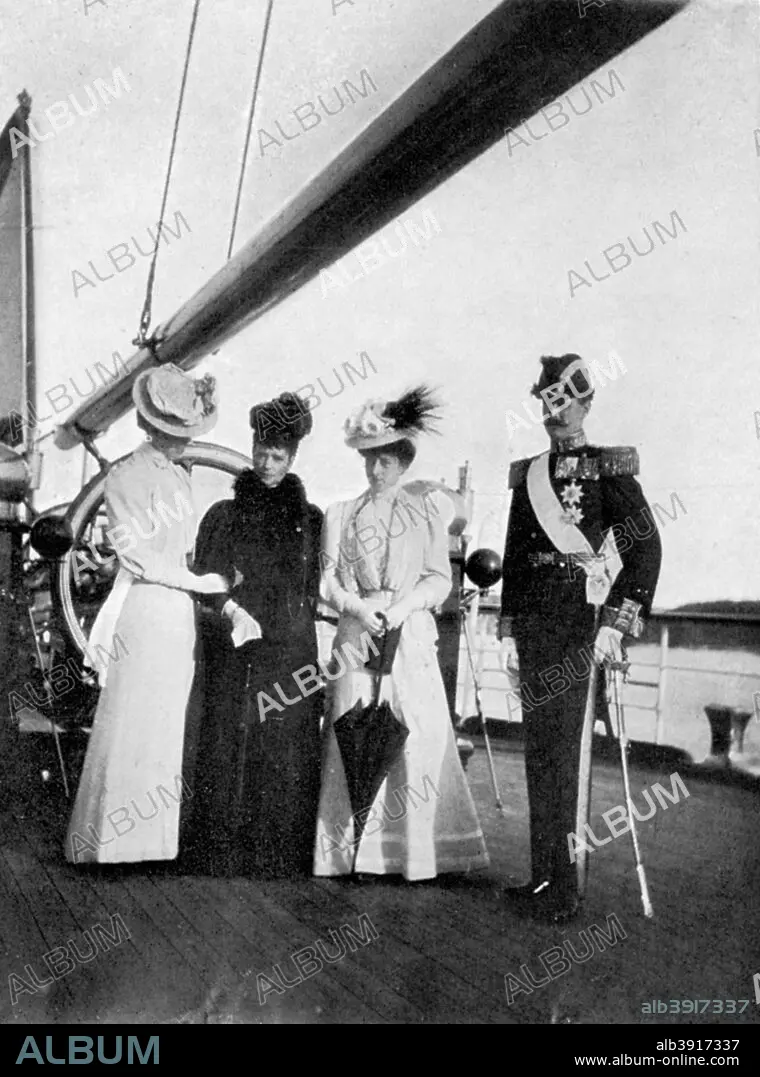 Caption: Empress Maria Feodorovna (1847-1928), Princess Victoria (1868-1935), Queen Maud (1869-1938) and King Haakon VII of Norway, on board the royal yacht Victoria and Albert III, 1908. From Queen Alexandra's Christmas Gift Book, Photographs from My Camera, by Queen Alexandra, published by The Daily Telegraph (London, 1908).