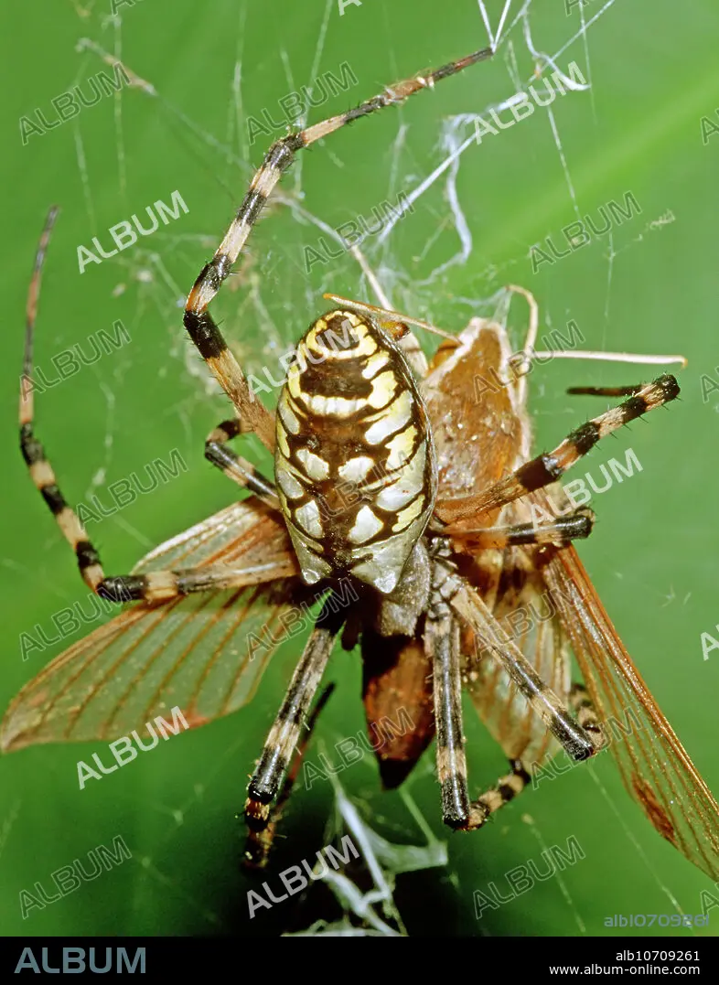 Caption: Female black and yellow garden spider (Argiope aurantia) eating a newly captured moth in Jacksonville, FL.
