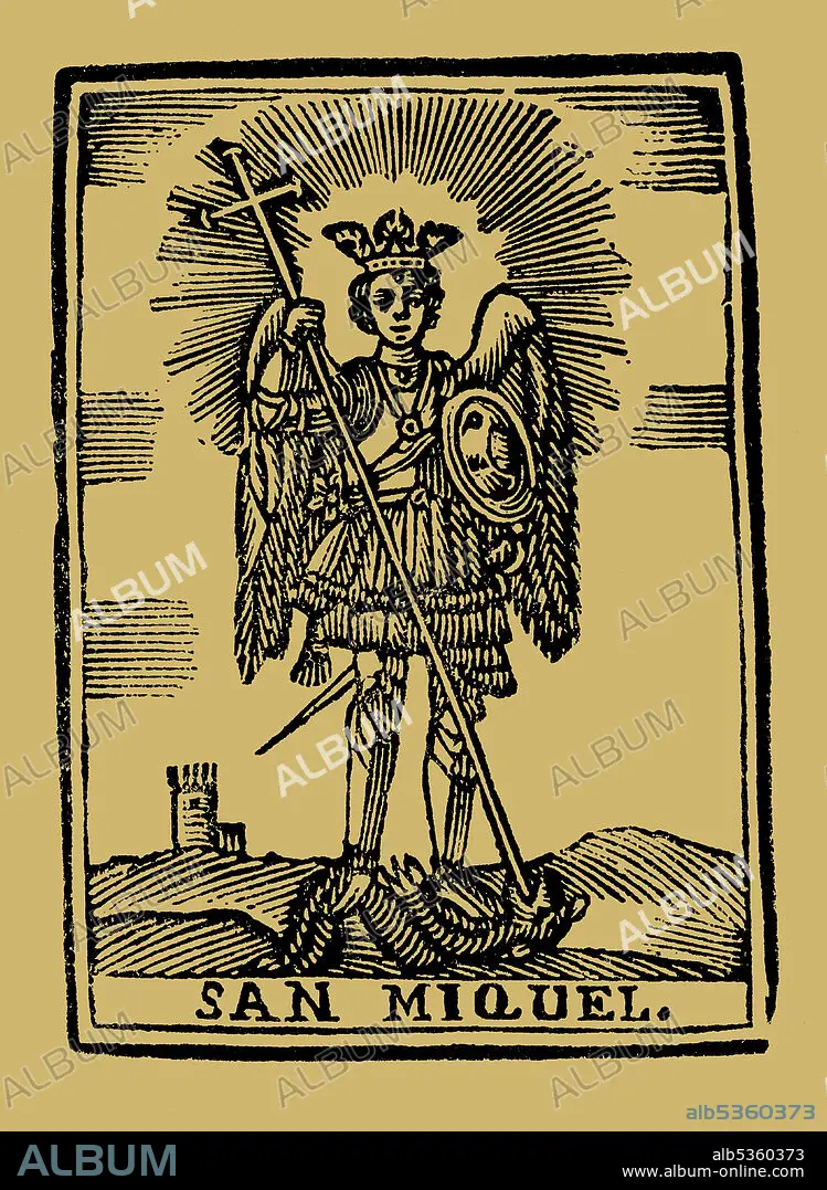 Automatic translation: San Miguel Arcangel; according to Jewish, Christian (Catholic, Orthodox, Coptic and Anglican churches) and Islamic traditions, he is the head of the armies of God. 19th century folk engraving