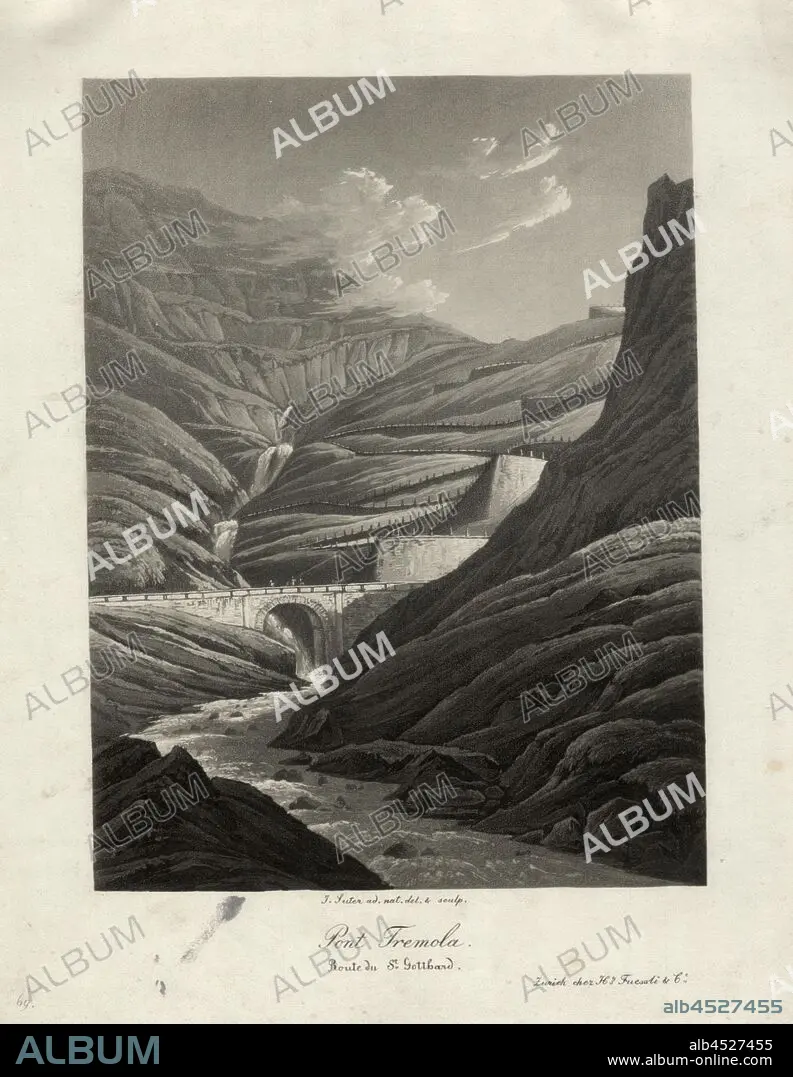 Pont Tremola, Tremolabrücke on the Gotthard route, Fig. 8, p. 48, Suter, Jakob (ad. nat. del. et sc.), 1833, Karl Franz Lusser, Joseph Meinrad Kälin, Jakob Suter: Funfzehn Ansichten der neuen St. Gotthards-Strasse vom St. Gotthard-Hospiz bis Lugano. Zürich: bey Heinrich Füssli, 1833