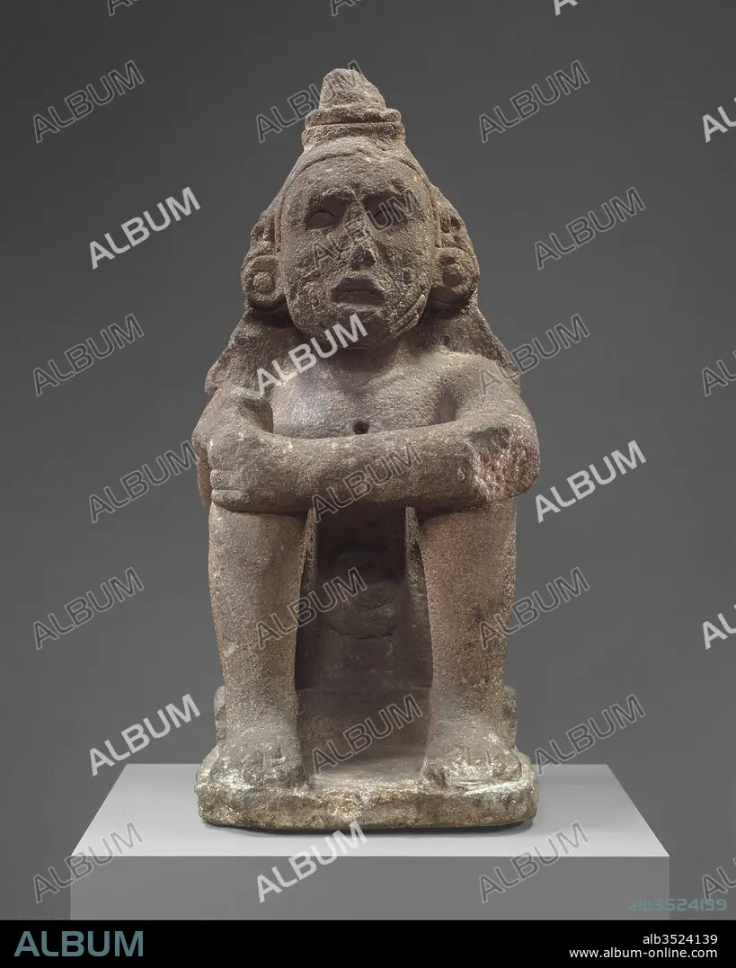 Caption: Seated Deity (Macuilcoatl), 15th–early 16th century, Mexico, Mesoamerica, Aztec, Basalt, Overall: 28 1/2 x 12 1/2 in. (72.39 x 31.75 cm), Stone-Sculpture, This sculpture depicts a seated male with his legs drawn up to his chest. His posture is straight and open with his left forearm resting across both knees. The figure’s right hand, which was likely broken in antiquity or during the early Colonial period, is modeled around a small void