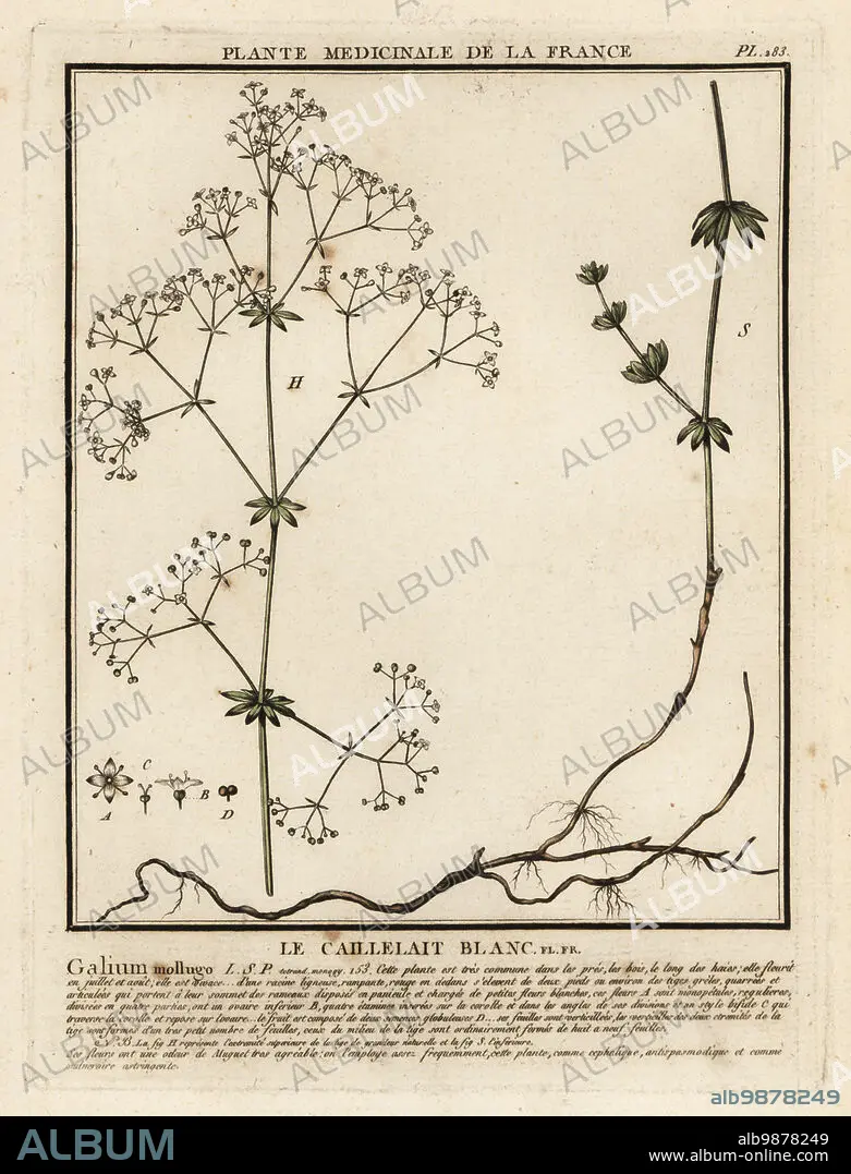 Caption: Hedge bedstraw or false baby's breath, Le caillelait blanc, Galium mollugo. Copperplate engraving printed in three colours by Pierre Bulliard from his Herbier de la France, ou collection complete des plantes indigenes de ce royaume, Didot jeune, Debure et Belin, 1780-1793.