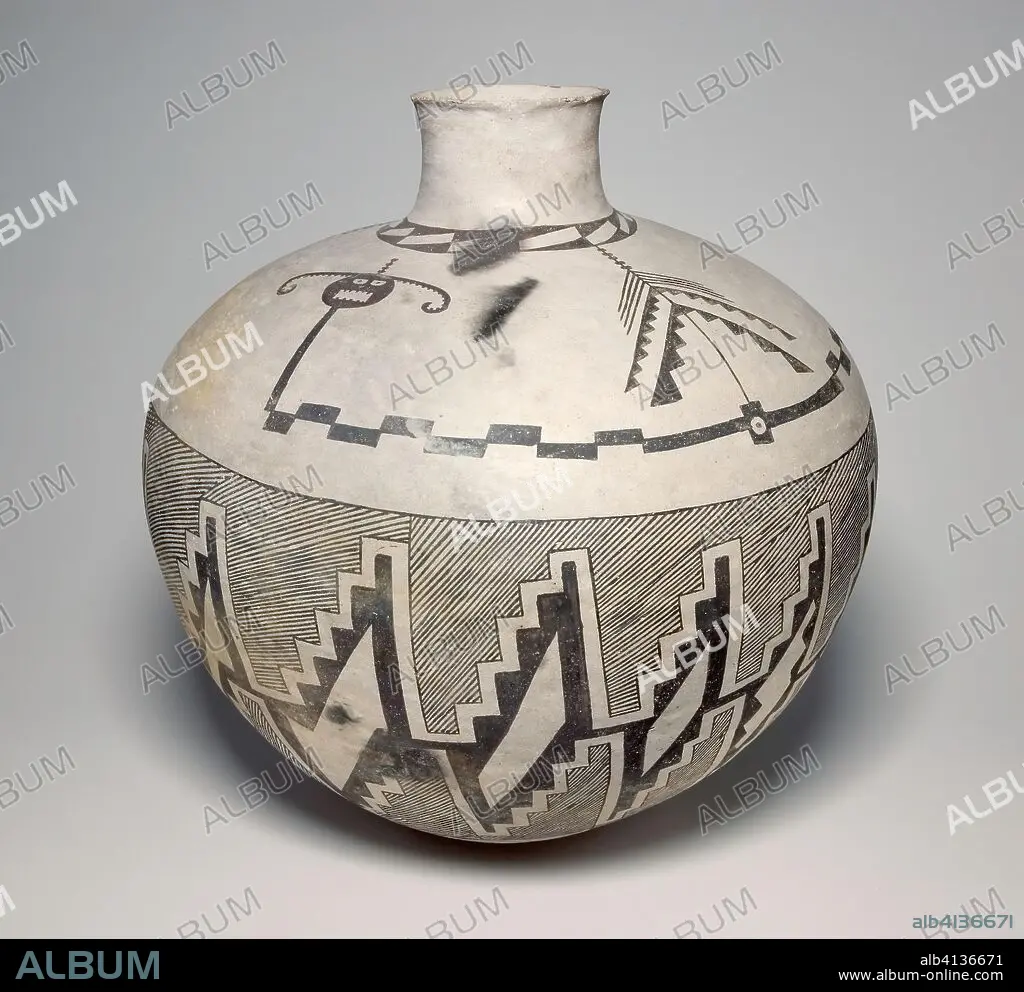 Caption: Jar with Horned Serpents and Interlocking, Hatched-and-Black Stepped Designs. Ancestral Pueblo (Anasazi), Socorro Black-on-white; West-central New Mexico, United States. Date: 950 AD-1400. Dimensions: 42.6 × 41.3 cm (16 3/4 × 16 1/4 in.). Ceramic and pigment. Origin: New Mexico.