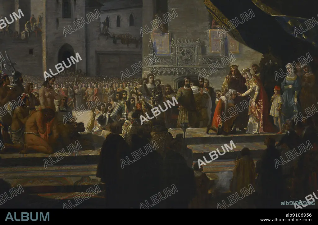 FRANCISCO GARCIA IBAÑEZ (B. 1825). SPANISH PAINTER.. Columbus received by the Catholic Monarchs in Barcelona (April 1493). Oil on canvas (111 x 144 cm) by Francisco Garcia Ibañez (b. 1825), 1845. Detail. Army Museum. Toledo, Spain. (On loan from Prado Museum, Spain).