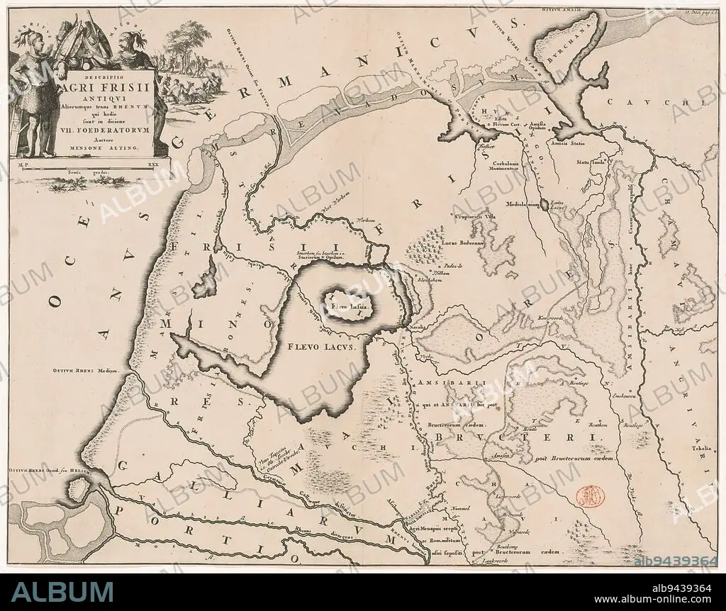 Caption: Historical map of the Netherlands with the areas of the Batavians and Frisians, Descriptio agri Frisii Antiqui (...) (title on object), Map of the Frisian areas in Roman times. Top left cartouche with title, surrounded by arms and Frisian chieftains Verritus and Malorix, depicted in the background warriors. Scale stick below cartouche: Semis gradus., print maker: Jan Luyken, Menso Alting, (mentioned on object), Netherlands, 1697 - 1700 and/or 1725, paper, engraving, etching, height 329 mm × width 420 mm