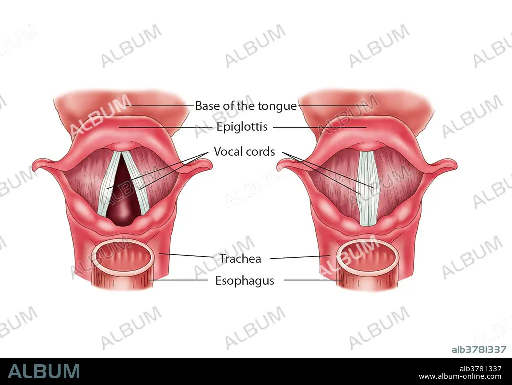 Caption: Showing the normal anatomy of the larynx. (Left) Abduction; the vocal cords are open. (Right) Adduction; the vocal cords are closed.