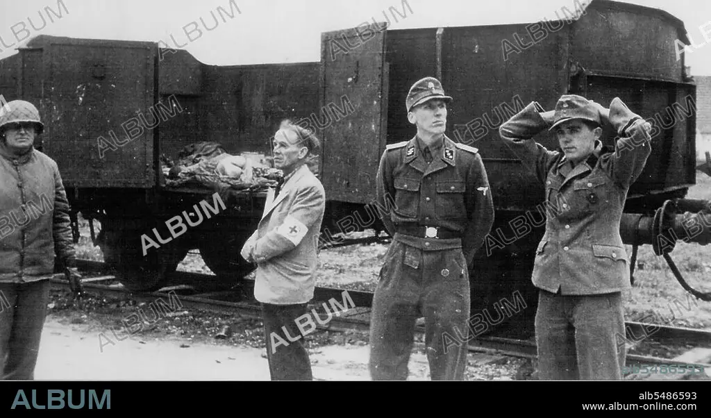 Title: The surrender of the Dachau concentration camp to American forces of the Army’s 42nd Infantry Division, April 29,1945 in Dachau, Germany. The German officer serving as commander of the camp, second from right, SS Lt. Heinrich Wickert (Wicker), is joined on his right by Swiss representative of the International Red Cross, Dr. Victor Maurer. The group was photographed alongside the “death train” of railcars holding the dead of those transferred to Dachau prior to the camp surrender. American Soldiers of the U. S. 7th Army, including the 42nd Infantry and 45th Infantry and 20th Armored Divisions participated in the camp’s liberation