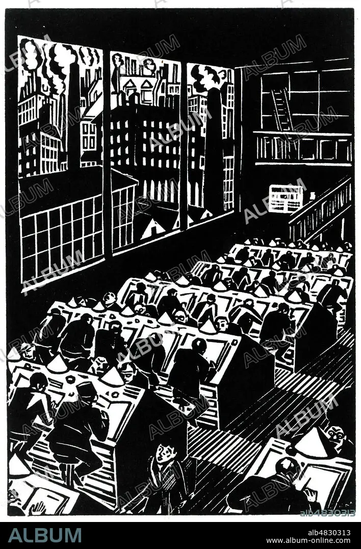 'La ville'. Hommes travaillant dans un open-space, vue sur les usines a l'exterieur. Illustration par Frans MASEREEL (1889-1972 = ADAGP) vers 1925. annees 20. Credit : Collection KHARBINE-TAPABOR.