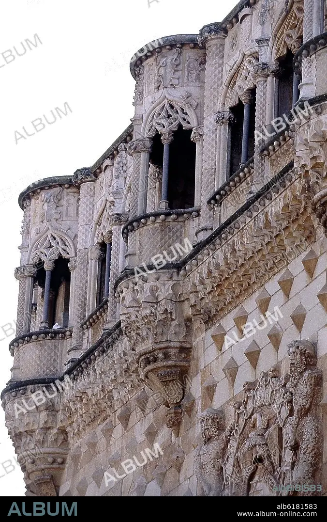 JUAN GUAS. EXTERIOR - GARITONES Y VENTANALES DE LA FACHADA PRINCIPAL - SIGLO XV - ESTILO REYES CATOLICOS