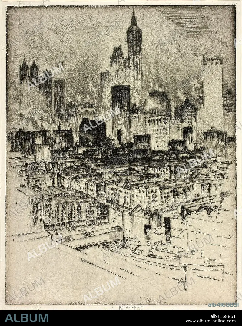 Caption: New York, from Brooklyn Bridge. Joseph Pennell; American, 1857-1926. Date: 1908. Dimensions: 279 x 215 mm (image); 336 x 238 mm (sheet). Etching on cream laid paper. Origin: United States.