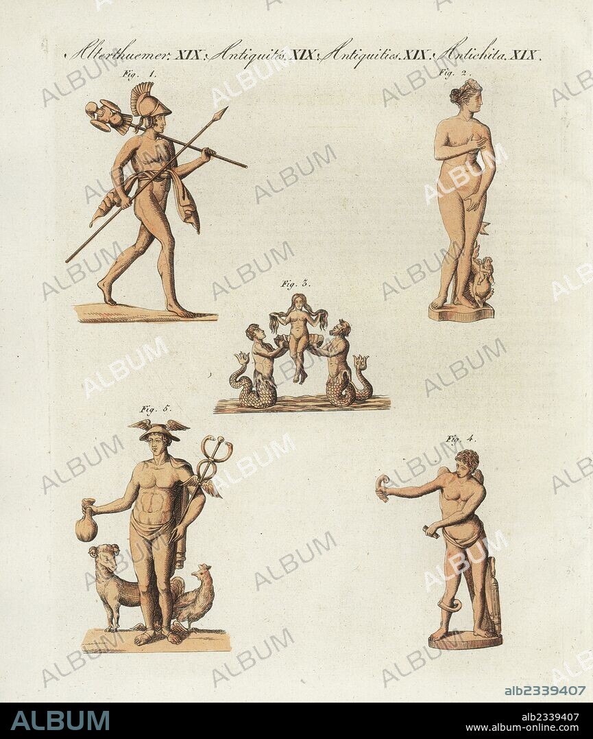 Greek and Roman gods: Mars 1, Venus 2,3, Eros 4, and Mercury 5. Handcoloured copperplate engraving from Bertuch's "Bilderbuch fur Kinder" (Picture Book for Children), Weimar, 1805. Friedrich Johann Bertuch (1747-1822) was a German publisher and man of arts most famous for his 12-volume encyclopedia for children illustrated with 1,200 engraved plates on natural history, science, costume, mythology, etc., published from 1790-1830.