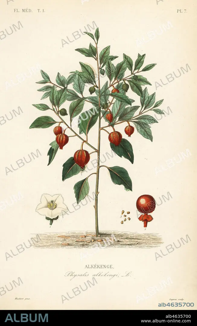 Caption: Bladder cherry or Chinese lantern, Physalis alkekengi, Alkekenge. Handcoloured steel engraving by Lagesse after a botanical illustration by Edouard Maubert from Pierre Oscar Reveil, A. Dupuis, Fr. Gerard and Francois Herincqs La Regne Vegetal: Flore Medicale, L. Guerin, Paris, 1864-1871.