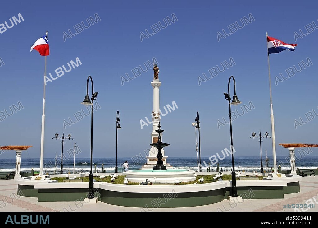 Caption: The Chilean and the Croatian flag, memorial, Croatian, Slavic square, waterside promenade, Croatia, Iquique, Norte Grande, northern Chile, Chile, South America, Europe