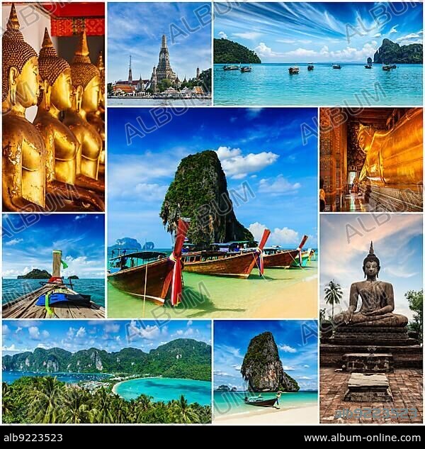 Thai travel tourism concept design, collage of Thailand images