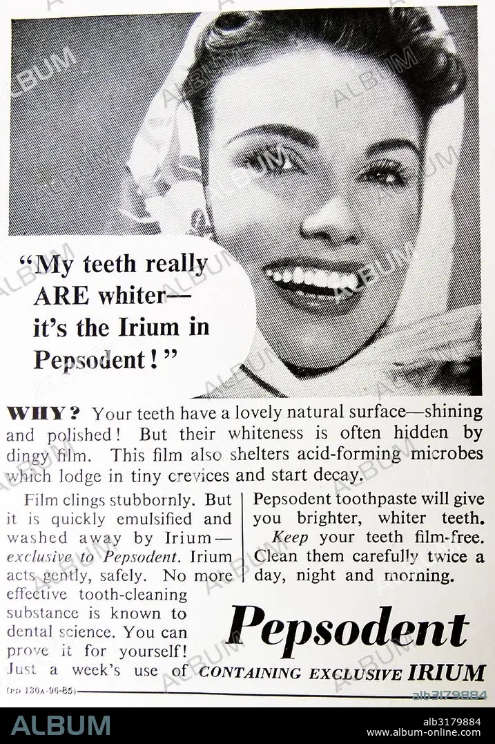Advert for pepsodent toothpaste, England, 1950.