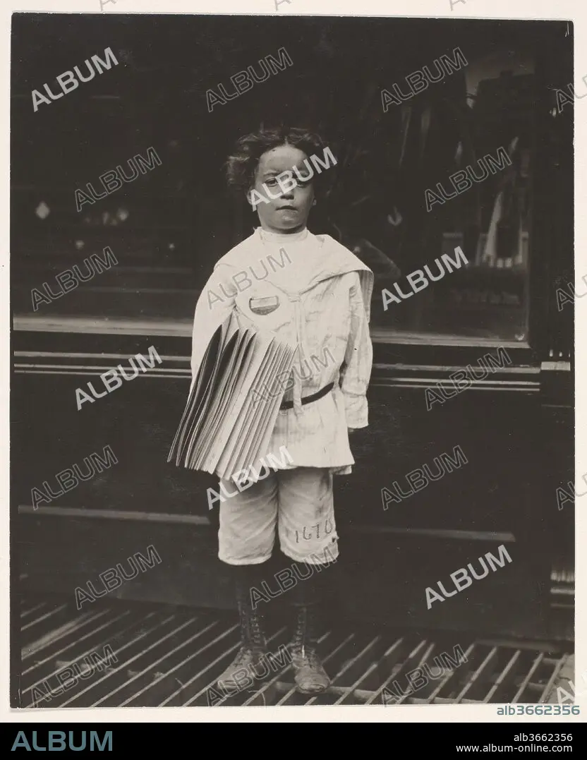 Jo Lehman, a 7 year old newsboy. 824 Third Ave., N.Y. City. He was selling in this Saloon. I asked him about the badge he was wearing. "Oh! Dat's me bruder's," he said. Location: New York, New York. Artist: Lewis Hine (American, 1874-1940). Dimensions: Image: 11.6 x 9.5 cm (4 9/16 x 3 3/4 in.). Date: July 1910.