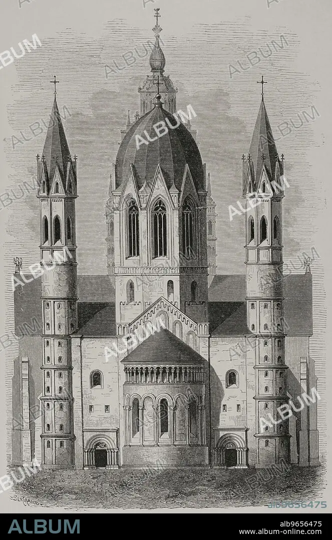 Caption: Mainz Cathedral, Germany. Romanesque style. General view of the outside. Engraving. "Les Arts au Moyen Age et a l'Epoque de la Renaissance", by Paul Lacroix. Paris, 1877.