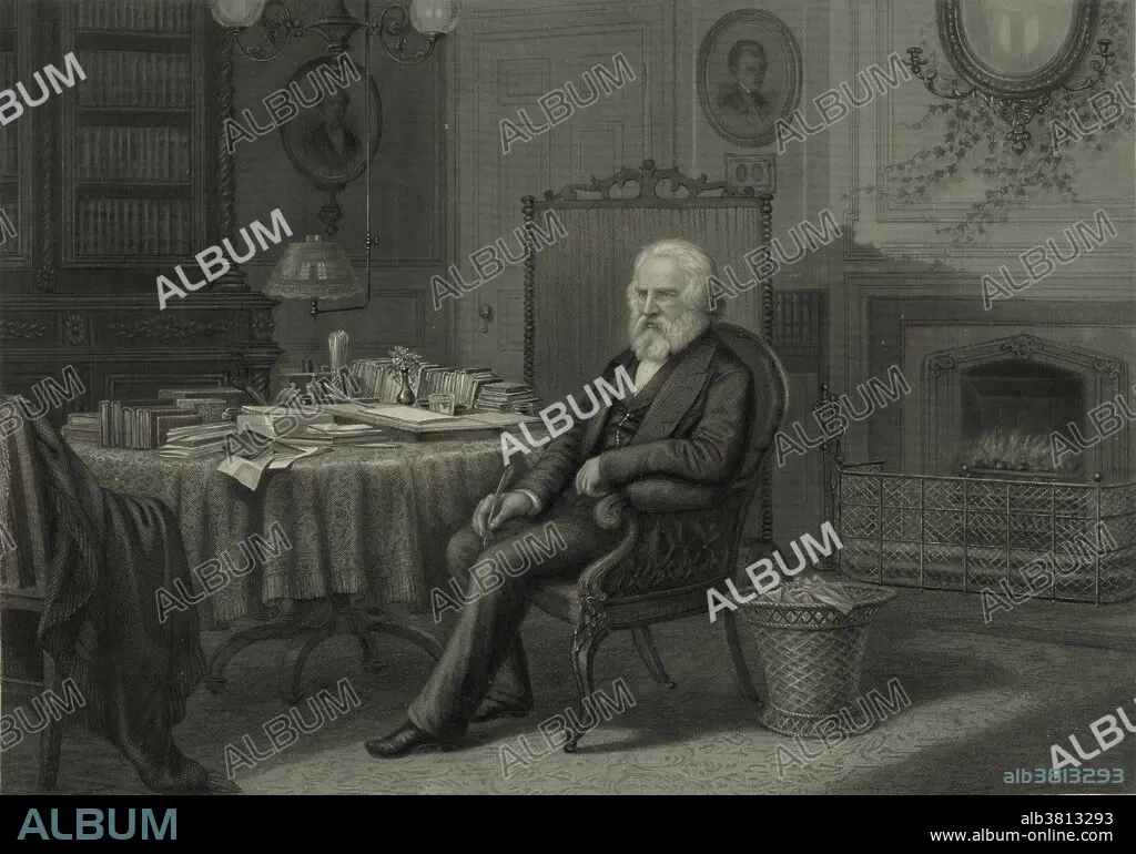 Caption: Henry Wadsworth Longfellow (February 27, 1807 - March 24, 1882) was an American poet and educator. He wrote many lyric poems known for their musicality and often presenting stories of mythology and legend. He became the most popular American poet of his day and also had success overseas. He studied at Bowdoin College. After spending time in Europe he became a professor at Bowdoin and, later, at Harvard College. His first major poetry collections were Voices of the Night (1839) and Ballads and Other Poems (1841). He retired from teaching in 1854, to focus on his writing. His first wife Mary Potter died in 1835, after a miscarriage. His second wife Frances Appleton died in 1861, after sustaining burns when her dress caught fire. After her death, Longfellow had difficulty writing poetry for a time and focused on his translation. His most famous works are: "Paul Revere's Ride", "The Song of Hiawatha", and "Evangeline". He was the first American to translate Dante Alighieri's The Divine Comedy, and was one of the five Fireside Poets. He died in 1882 at the age of 75.