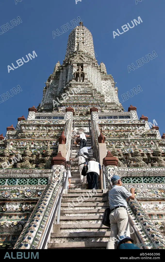 Title: Thailand: Visitors climb the Khmer-style central prang at Wat Arun (Temple of Dawn), Bangkok