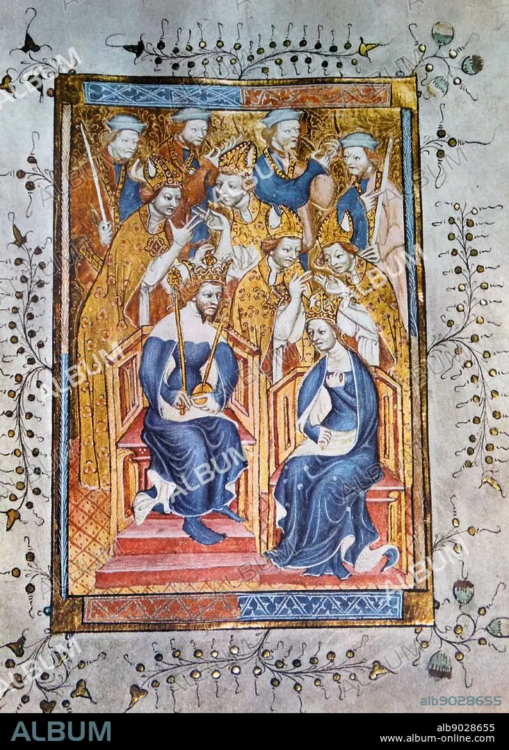Caption: King Richard II and Anne of Bohemia, his Queen. From the fourteenth-century Coronation Order of Service, the Liber Regalis. The manuscript is thought to have been written and illustrated for Queen Anne's Coronation in 1382 and was used for all coronations up until Queen Elizabeth I. From The Island Race, a 20th century book that covers the history of the British Isles from the pre-Roman times to the Victorian era. Written by Sir Winston Churchill and abridged by Timothy Baker.
