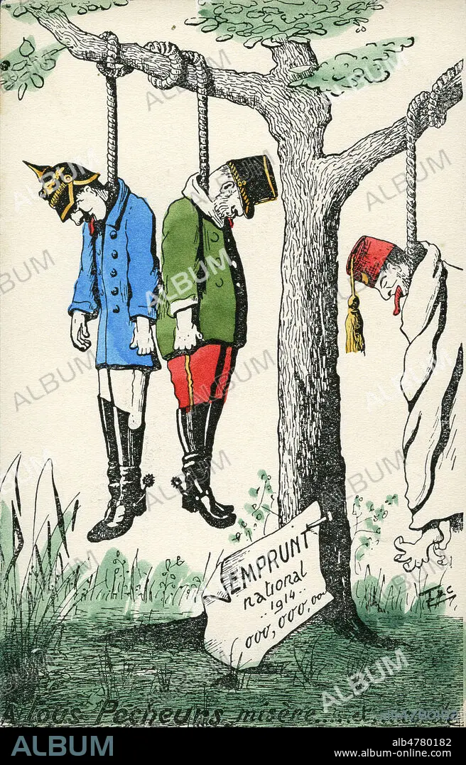 A tous pecheurs, misere... et... corde. L'empereur d'Allemagne, le roi de Bulgarie et le sultan ottoman pendus. Caricature de TAC pour une carte postale vers 1917. Credit : Collection IM/Kharbine/Tapabor.