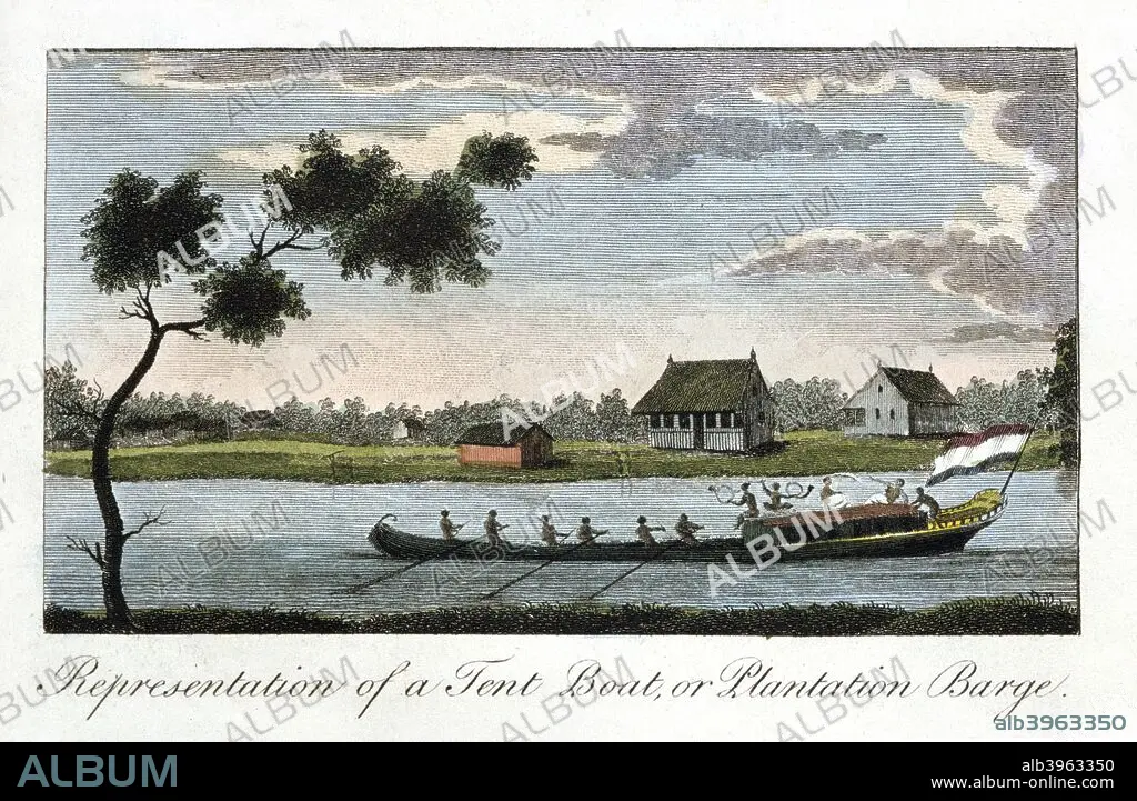 Caption: 'Representation of a Tent Boat, or Plantation Barge', 1813. From 'Narrative, of a Five Years' Expedition, against the Revolted Negroes of Surinam, in Guiana, on the West Coast of South Africa', volume II, by J G Stedman, London, 1813. Engravings were made from drawings by the author.