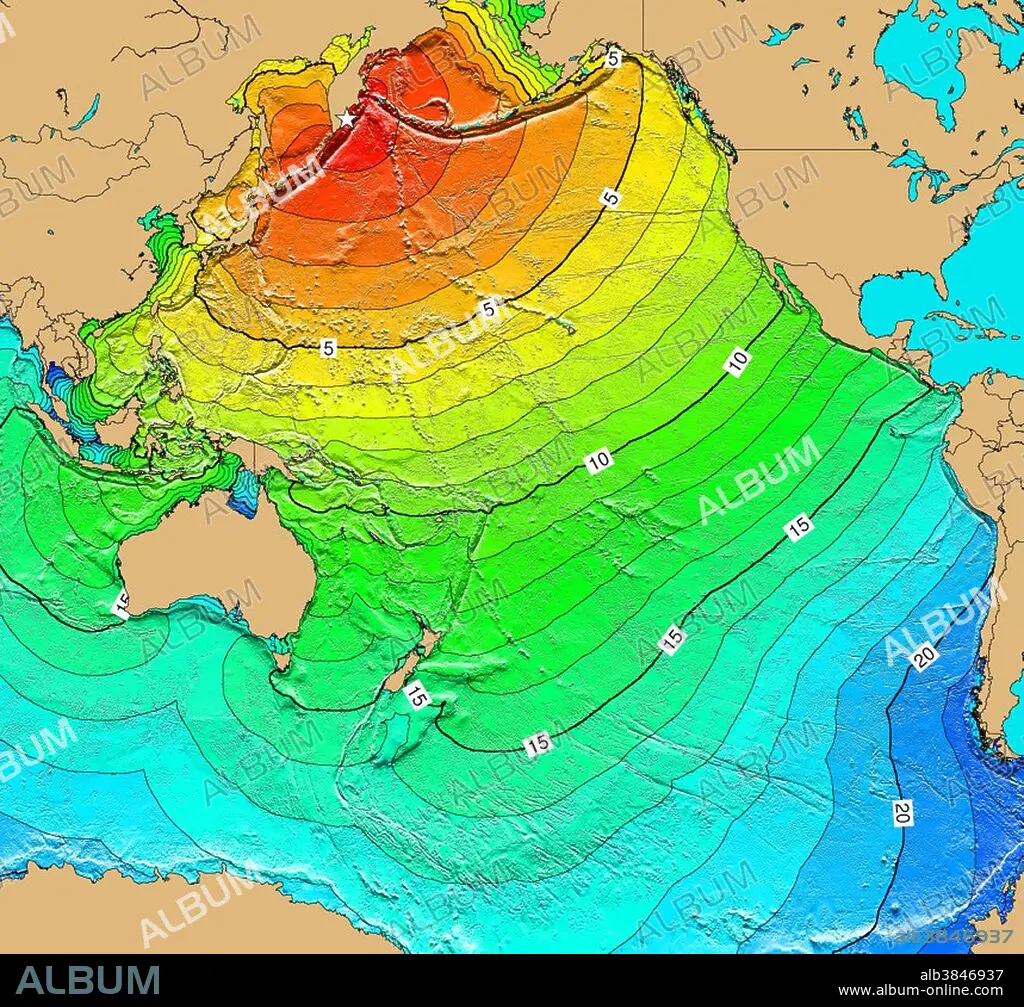 The magnitude 9.0 Mw earthquake on November 4, 1952 off the east coast of Kamchatka generated a 13-meter wave locally. The waves struck the Hawaiian Islands at 1:00 pm. Property damage from these waves in the Hawaiian Islands was estimated at $800,000 to $1,000,000; however no lives were lost. It also caused damage on the west coast of the United States and was observed on tide gauges throughout the Pacific Basin. Map generated using Tsunami Travel Time (TTT) software: calculates first-arrival travel times on a grid for a tsunami generated at an earthquake epicenter. Map contours: 1 hour intervals: red 1-4 hour arrival times, yellow: 5-6 hour arrival times, green: 7-14 hour arrival times, blue: 15-21 hour arrival times. Maps were generated from earthquake epicenters in the NGDC Global Historical Tsunami Database using NGDC 2 Minute Gridded Global Relief Data bathymetry. Maps do not provide the height or the strength of the wave, only the arrival times.