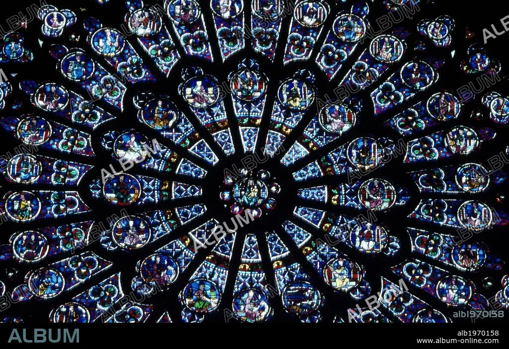 North rose window of Notre Dame Cathedral, Paris, Ile-de-France. Detail. France.