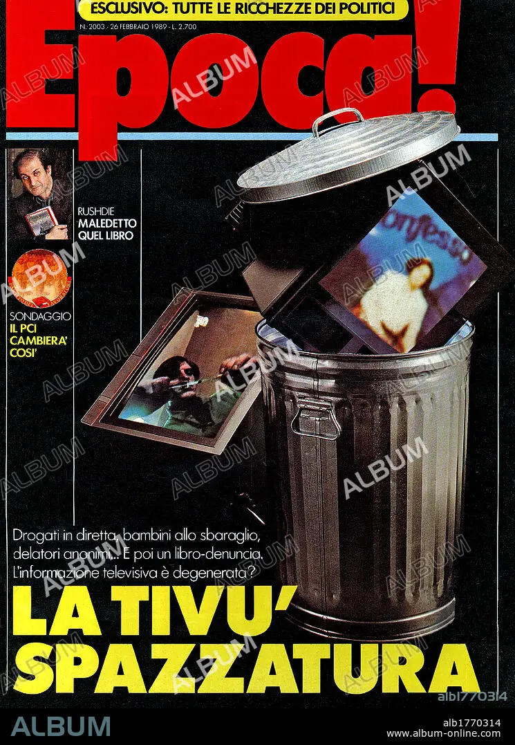 Caption: The cover of the Italian weekly magazine Epoca showing a television leaning against a litter bin. Indian-British writer Salman Rushdie is featured in the box. 26th february 1989