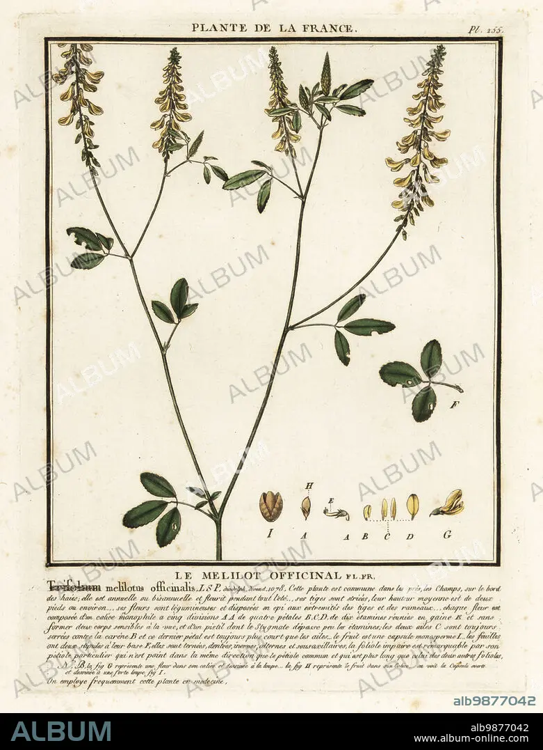 Caption: Yellow sweet clover, Melilotus melilotus-officinalis. Le melitot officinale, Trifolium melilotus officinalis. Copperplate engraving printed in three colours by Pierre Bulliard from his Herbier de la France, ou collection complete des plantes indigenes de ce royaume, Didot jeune, Debure et Belin, 1780-1793.