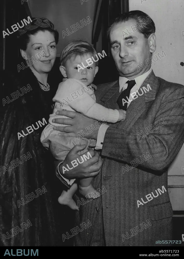 "Cruel Sea" Man Off To Ottawa -- Mr. Nicholas Monsarrat, author of that well-known novel "The Cruel Sea", and Director U.K. Information Bureau, photographed with his wife and 10 months-old son Mark, when they left Buston Station this morning for Ottawa. April 29, 1955.
