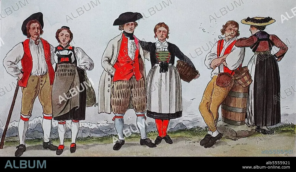 Caption: Mode, Kostüme, Kleidung in der Schweiz, um 1804, von links, junges Paar aus dem Kanton Bern, Paar aus dem Kanton Aargau und Paar aus dem Kanton Friborg, digital verbesserte Reproduktion einer Illustration aus dem 19. Jahrhundert