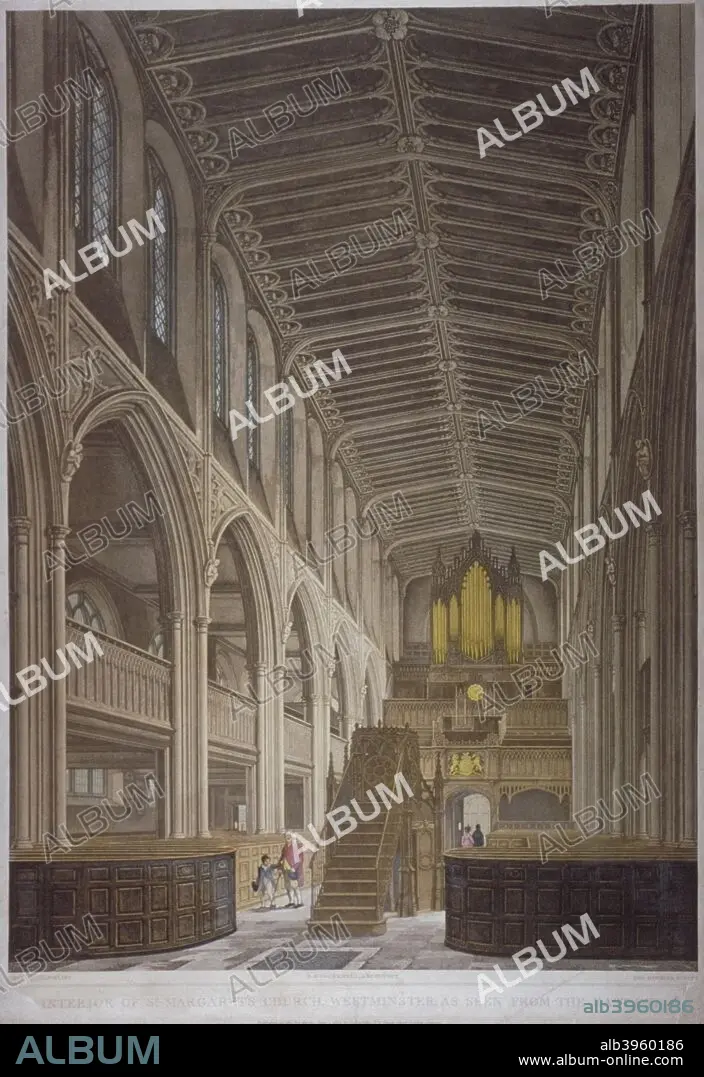 Caption: Interior of St Margaret's Church, Westminster, London, 1804. View looking west towards the organ, with figures in the nave.