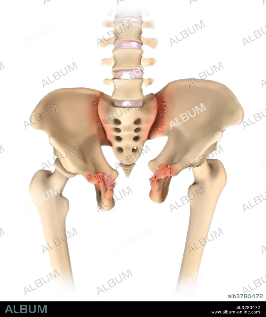 Caption: An illustration of a pelvic fracture resulting from a heavy impact to the groin (pubis), known as an open book fracture. This injury is typically seen in motorcycle accidents in which the left and right halfs of the pelvis separate at the front and rear, resembling an open book.