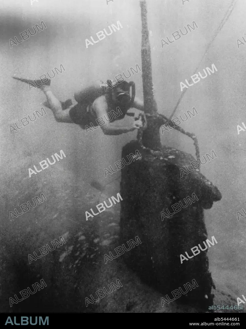 Jay Skidmore, Chula Vista, Calif., U.S. Navy photographer, grasps the periscope of a wrecked Japanese midget submarine resting upright on a coral bed a mile outside of Pearl Harbor. The sub was found accidentally by navy divers on June 13, in 70 feet of water. The navy said it believed the midget was one of three taking part in the Japanese attack on Pearl Harbour, Dec. 7, 1941. One was sunk inside the harbor, a second was beached. December 7, 1941. (Photo by Donald Williams, U.S. Navy).