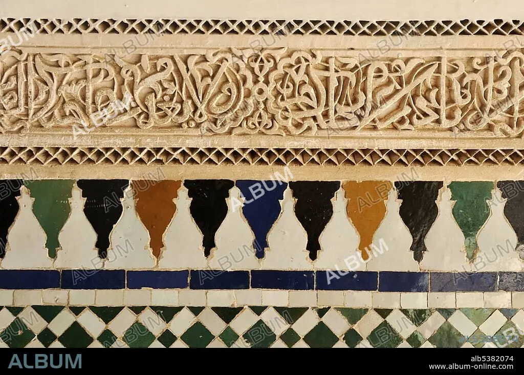 Caption: Zellige, Zillij, Zellij, terra cotta tilework, wall decoration in the El Bahia Palace, Medina, Marrakesh, Unesco World Heritage Site, Morocco, North Africa, Africa