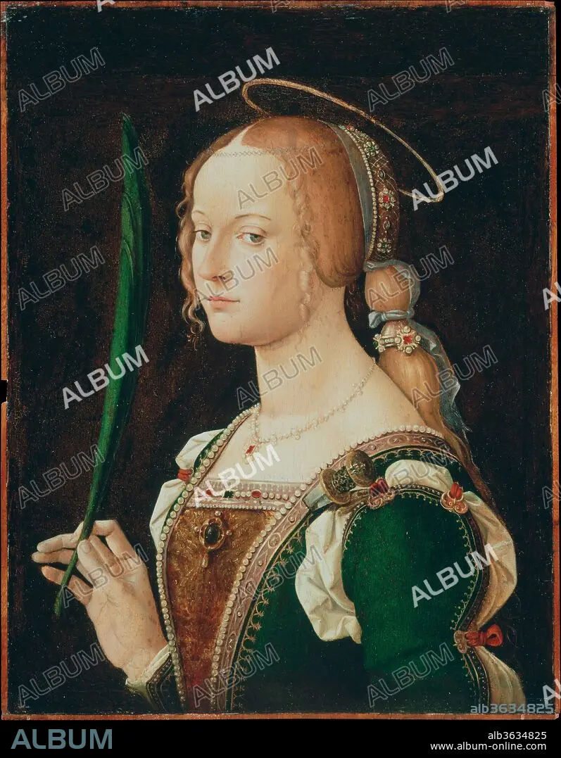 Caption: Saint Justina of Padua. Artist: Bartolomeo Montagna (Bartolomeo Cincani) (Italian, Vicentine, before 1459-1523). Dimensions: Overall, with added strips, 19 1/2 x 15 1/8 in. (49.5 x 38.4 cm); painted surface 19 1/8 x 14 3/4 in. (48.6 x 37.5 cm). Date: 1490s.