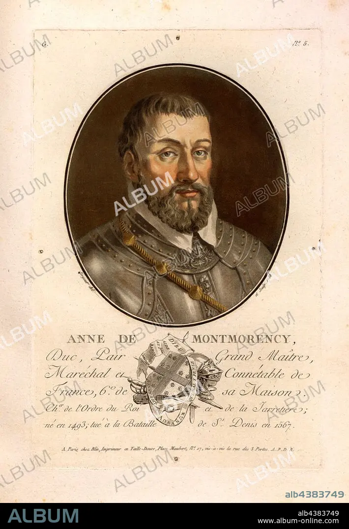 Caption: Anne de Montmorency, Anne de Montmorency, Duke of Montmorency and Pair of France, signed: Sergent (del. Et sculp.); chez Blin, G no. 5, Sergent, Antoine Louis François (del. et sculp.); Blin (chez), Antoine François Sergent-Marceau: Portraits des grands hommes, femmes illustres et sujets mémorables de France: gravés et imprimés en couleurs. Dédié au Roi. Bd. 2. Paris: chez Blin, Imprimeur en Taille-Douce, [1786-1792]
