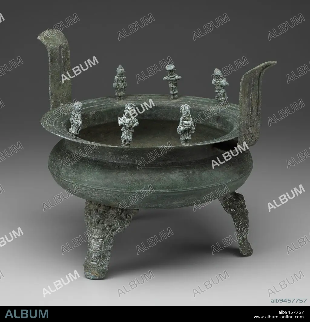 Tripod Incense Burner, 14th century, 9 15/16 x 12 1/8 x 10 1/16 in. (25.24 x 30.8 x 25.56 cm), Bronze, Vietnam, 14th century, Contact with China during the Han dynasty (206 b.c.-220 a.d.) greatly influenced Vietnamese art and culture for centuries to come. As the Vietnamese adopted Confucianism and Chinese style ancestor worship, their ritual bronze tripods, vases, and even coins took on Chinese characteristics. While this rare fourteenth century Vietnamese tripod has a Chinese form, the small figural images attached to the rim are entirely a Vietnamese invention. The figures, clad in native dress, each carry an offering perhaps to an altar table where a censer such as this would have been used in ritual ceremonies.