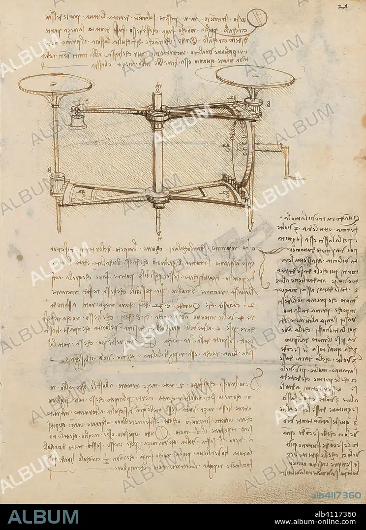 Caption: Folio f 21r. Codex Madrid I (Ms. 8937) "Treaty of statics and mechanics", 192 folios with 384 pages. Internal format: 215 x 145 mm. CRAFTS. APPLIED MECHANICS (COMPONENTS). APPLIED MECHANICS (MACHINES AND WITS). PERSPECTIVE, OPTICS, PAINTING, DRAWING. PRINCIPLES OF MECHANICS, CINEMATICS, DYNAMICS.