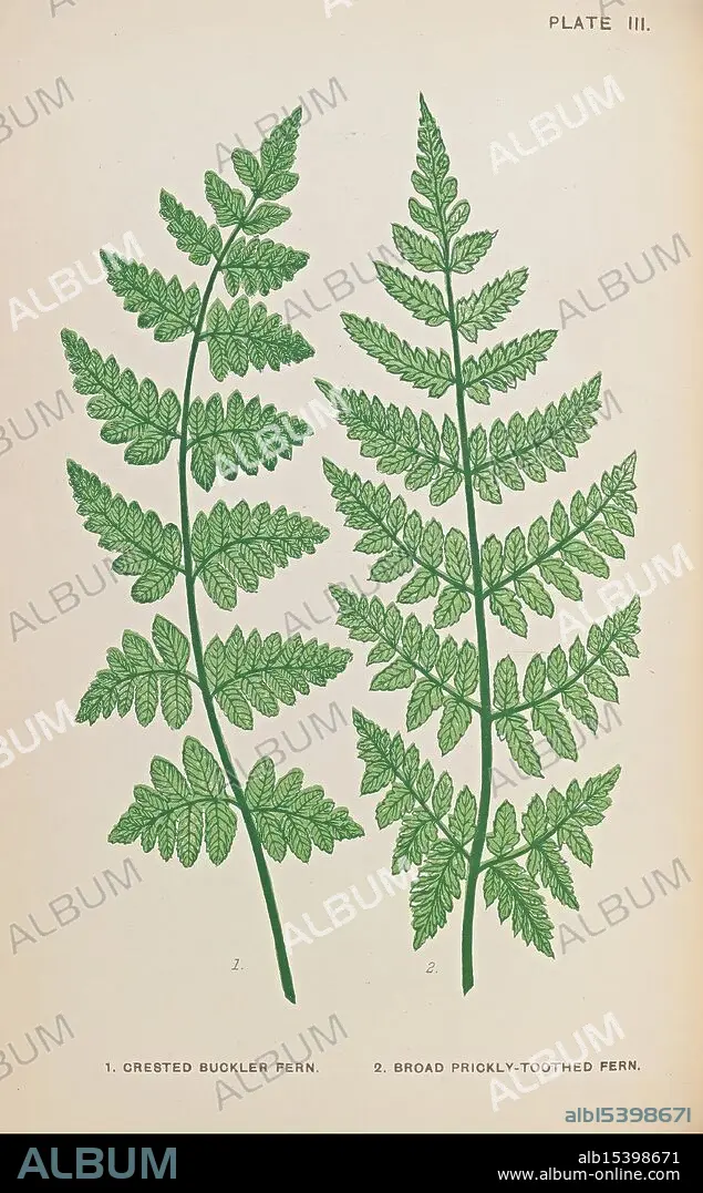 Caption: British ferns, London, Gibbings, 1903, filices, Great Britain, ferns, spores, crested buckler fern, broad prickly toothed fern, A detailed illustration showcasing two distinct types of ferns. On the left, the Crested Buckler Fern is depicted, characterized by its uniquely shaped fronds that taper into a crested appearance. The right side features the Broad Prickly-Toothed Fern, identifiable by its broader leaflets that have serrated edges. Each fern is labeled with its corresponding name and enumeration, reflecting botanical accuracy and a focus on the intricate details of their foliage. The arrangement emphasizes the beauty and diversity of plant life, highlighting the unique features of each species.